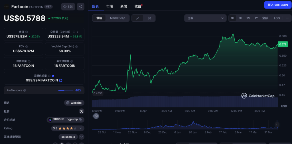 全球金融市場與加密貨幣在多重因素影響全面下挫的背景下,一個名不見經傳的 Solana 生態系迷因幣 Fartcoin 上演了驚人的上漲行情,根據 CoinGecko 數據顯示今日( 8) 日,Fartcoin 在過去 24 小時內飆漲超過 30%,價格一度觸及 0.60 美元關卡,現今市值約5.578億美元。