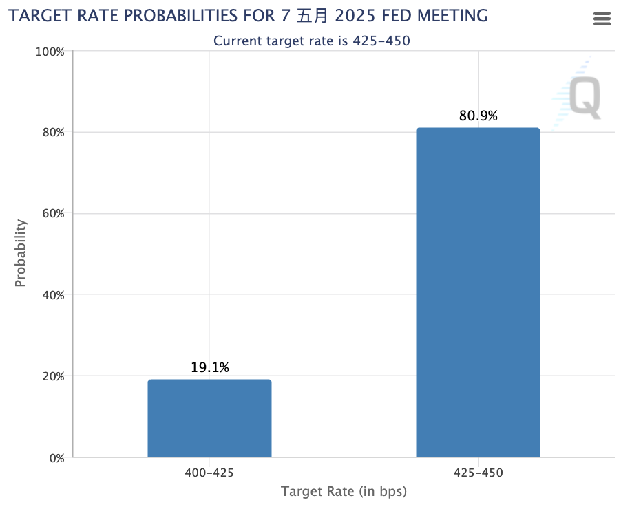 根據 CME FedWatch 工具顯示,投資人對聯準會 5 月維持利率不變的預期已上升至 80.9%,而降息的機率則從前一日的 44.5% 驟降至 19.1%;即便到 6 月,市場仍僅預期最多降息 1 碼(25 個基點)的機率為 61.7%。
