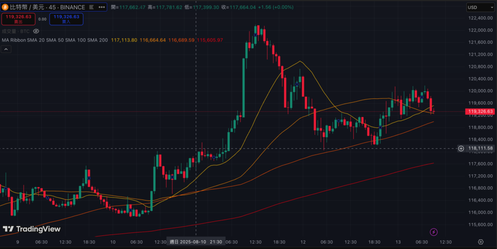 比特幣則相對弱勢,仍在 12 萬美元附近窄幅震蕩,早上稍微從跌破至119300水位。