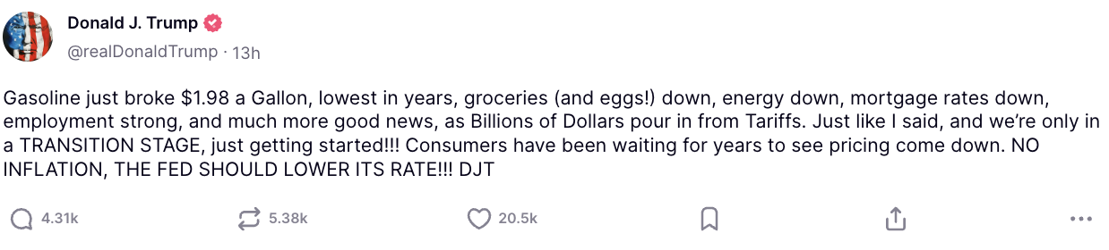 汽油價格剛剛跌破每加侖 1.98 美元,創下多年新低,雜貨(還有雞蛋!)價格下跌,能源價格下跌,房貸利率下跌,就業強勁,還有更多好消息,因為數十億美元正透過關稅湧入。