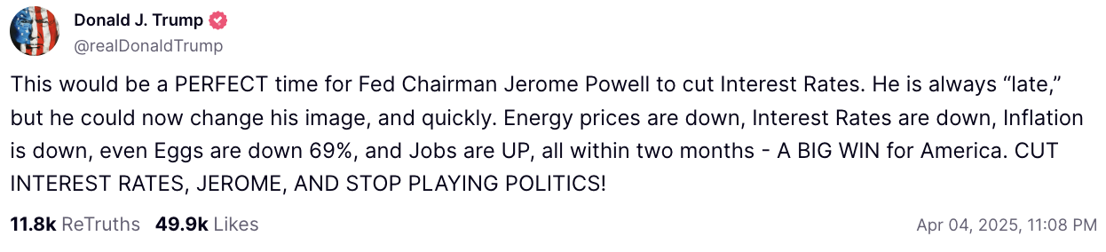 值得注意的是,在鮑爾公開表態前,川普於 Truth Social 發文「點名施壓」,要求鮑爾「快點降息、別再搞政治」,並強調能源與食品價格已顯著下滑,就業數據強勁,是「完美的降息時機」。