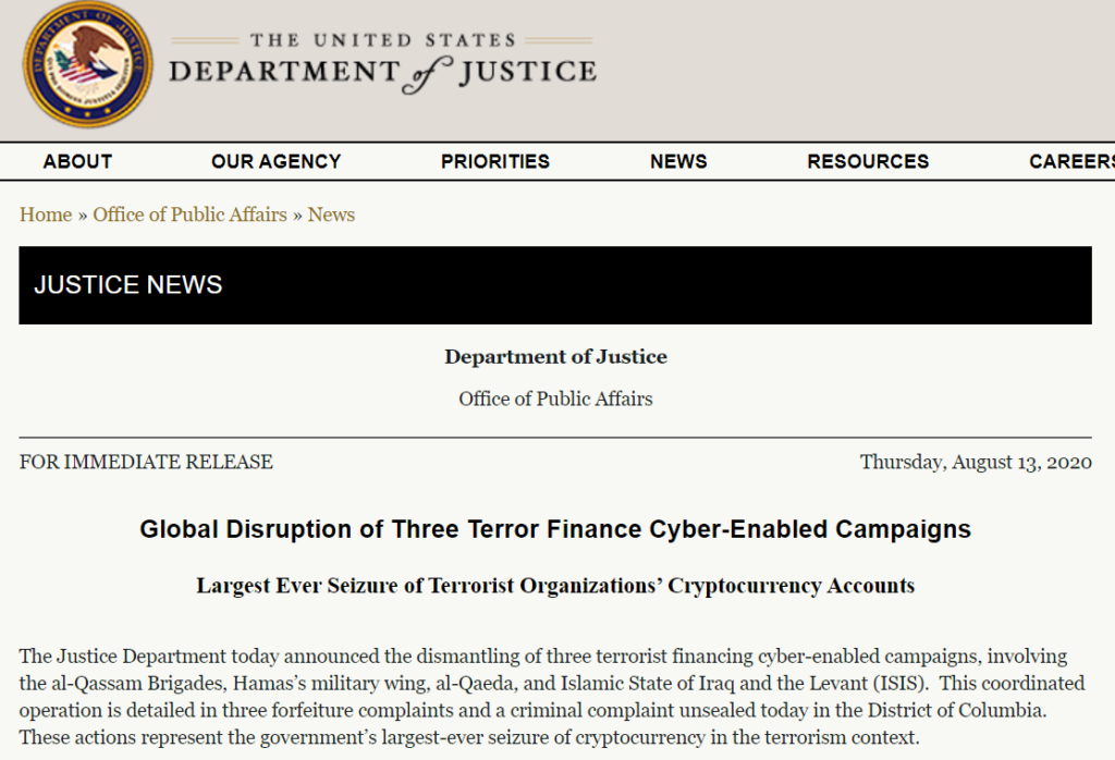 國司法部昨日宣布,他們已經查獲 300 多個蓋達組織(al Qaeda)、哈馬斯軍事派別 al-Qassam Brigades、伊斯蘭國(ISIS)等恐怖組織所持有的加密貨幣帳戶,以及其中數百萬美元的加密貨幣。美國司法部稱這是「有史以來最大的恐怖組織加密貨幣帳戶扣押行動」。