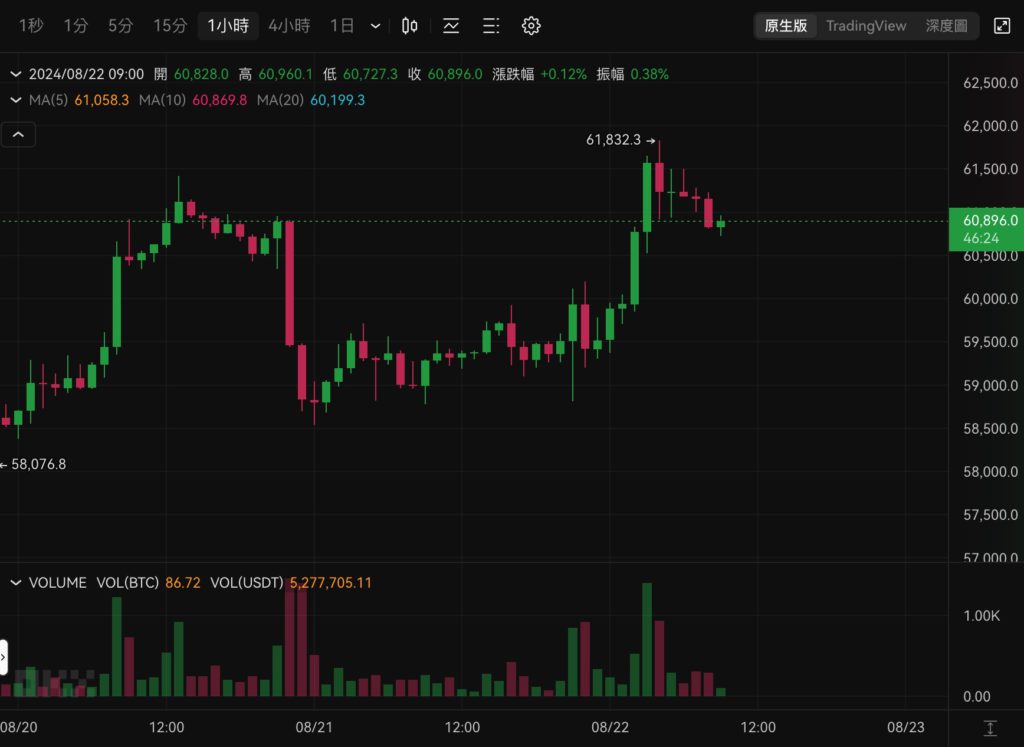 或許是受益於聯準會降息在即,比特幣昨晚短暫插針 58,815 美元之後一路震盪上漲,稍早清晨四點最高來到 61,823 美元。撰稿當下報 60,896 美元,近 24 小時漲幅達 3.12%。
