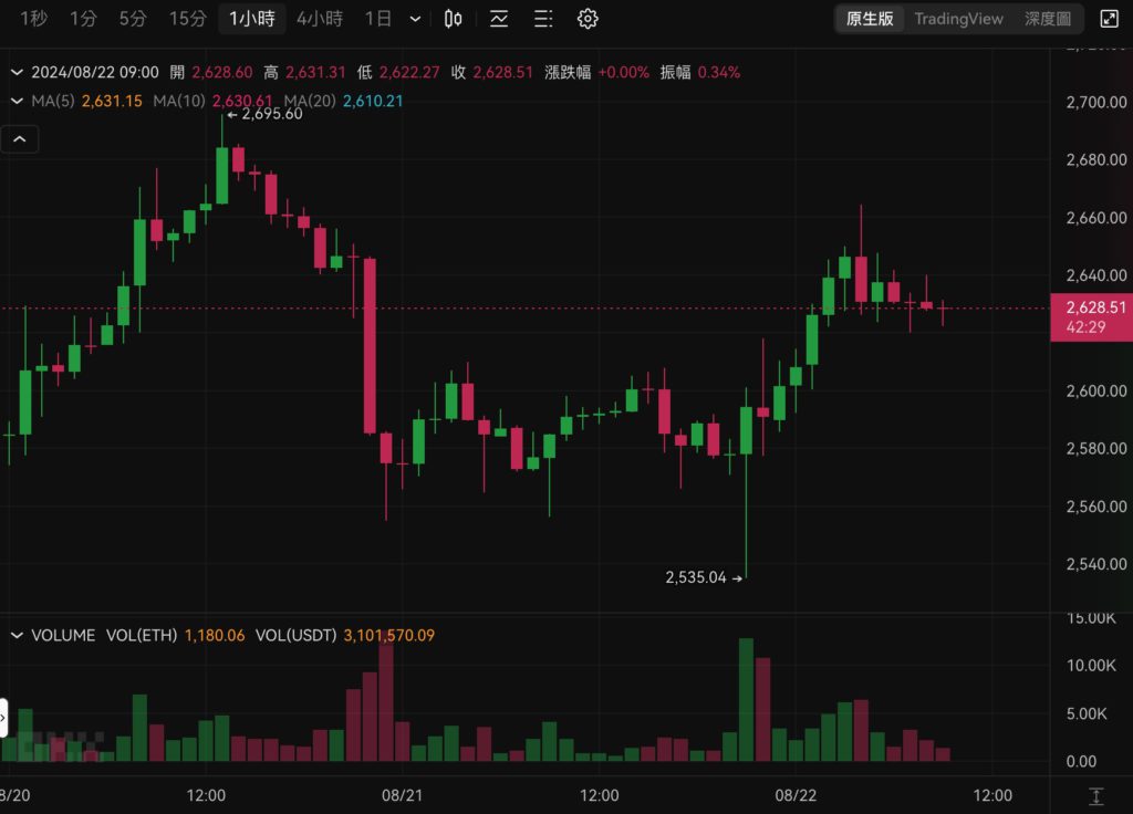 以太坊走勢雷同但漲幅更小一些,撰稿當下報 2,628 美元,近 24 小時上漲了 1.82%。