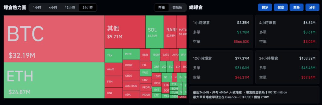 根據 Coinglass 數據顯示,過去 24 小時,加密貨幣全網永續合約爆倉金額達 1 億美元,共有近 4 萬人遭到清算。整體來說並不算特別高,如果主力有意清洗空頭倉位,那後續可能會再拉高。
