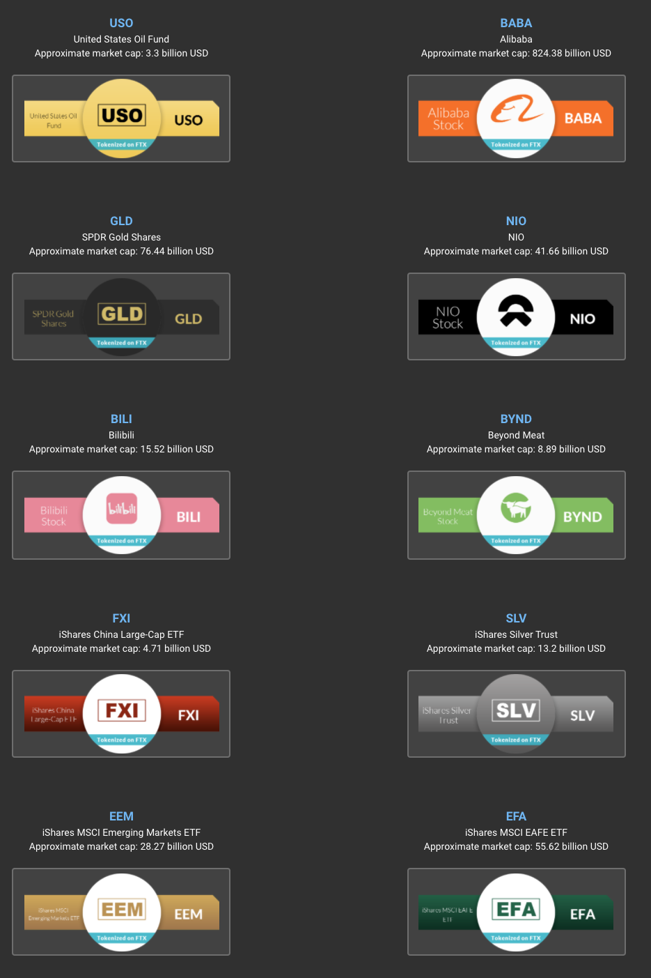 目前候選通證包括商務平台阿里巴巴(BABA)、中國知名影音平台 Bilibili(BILI)、智能電動汽車蔚來(NIO)、未來肉公司 Beyond Meat(BYND)、SPDR 黃金 ETF(GLD)、安碩白銀信託基金(SLV)、iShare 中國大型股 ETF(FXI)、ishare MSCI 新興市場 ETF(EEM)、ishare MSCI 歐澳遠東 ETF(EFA)、美國石油指數(USO)等十個。