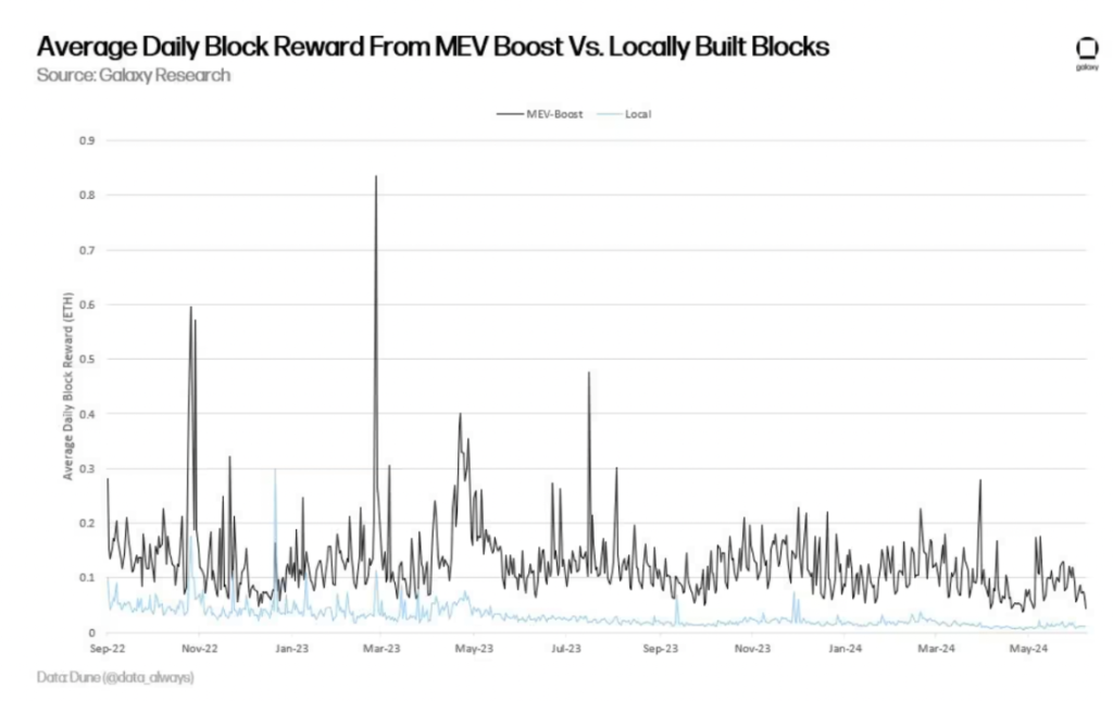 根據 Galaxy 的計算,MEV 可將驗證者收益率提高約 1.2%。與其他型別的驗證者收入(包括新 ETH 發行和優先費用)相比,來自 MEV 的驗證者獎勵佔比約為 20%。一些人將 MEV 歸因於給予區塊提議者的額外價值,該價值不是來自優先費用或 ETH 發行。然而,另一些人認為,如果優先費用是通過成功的搶先交易或反向交易獲得資金的,那麼它本身可以代表 MEV 利潤。為了解釋優先費用本身可能包含 MEV 的事實,其他方法比較了通過 MEV-Boost 軟體構建的區塊和未通過 MEV-Boost 軟體構建的區塊的價值。