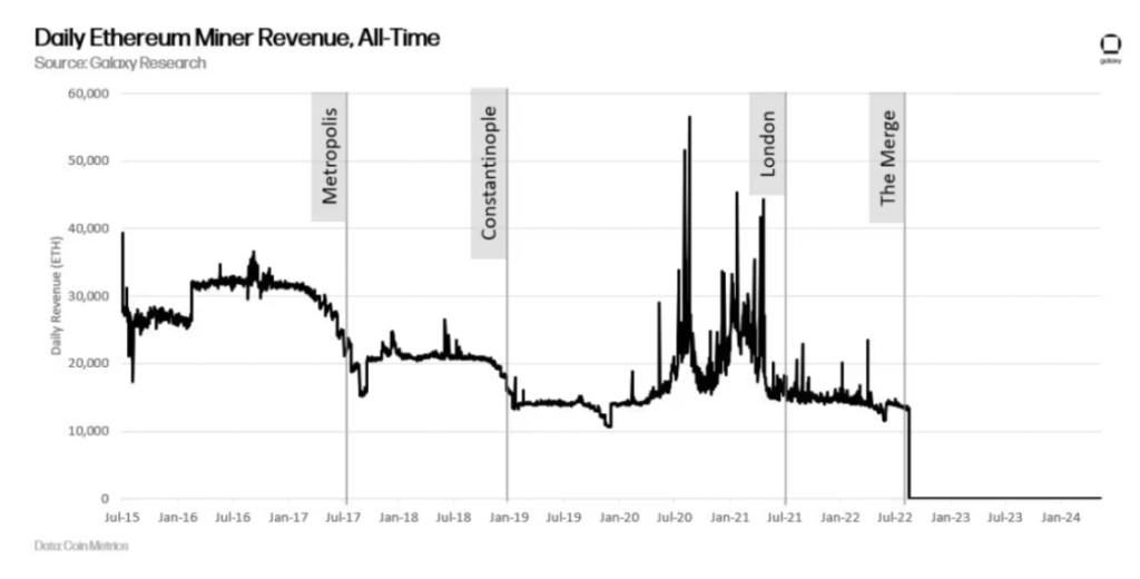 以太坊最初的區塊獎勵設定為 5 ETH/ 區塊。在 2017 年 9 月的大都會升級中,它被降至 3 ETH 。然後在 2019 年 2 月的君士坦丁堡升級中,它又降至 2 ETH 。隨後,2021 年 8 月的倫敦升級中,礦工們從交易費中獲得的獎勵被燒燬,然後在 2022 年 9 月的合並升級中,挖礦獎勵在網路上被徹底廢除。