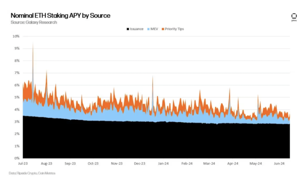 當然,質押者在承擔風險的同時,也能從質押的 ETH 中獲得大約 4% 的年化收益。這些獎勵來自新的 ETH 發行、以太坊使用者在其交易中附加的優先費用以及 MEV。
