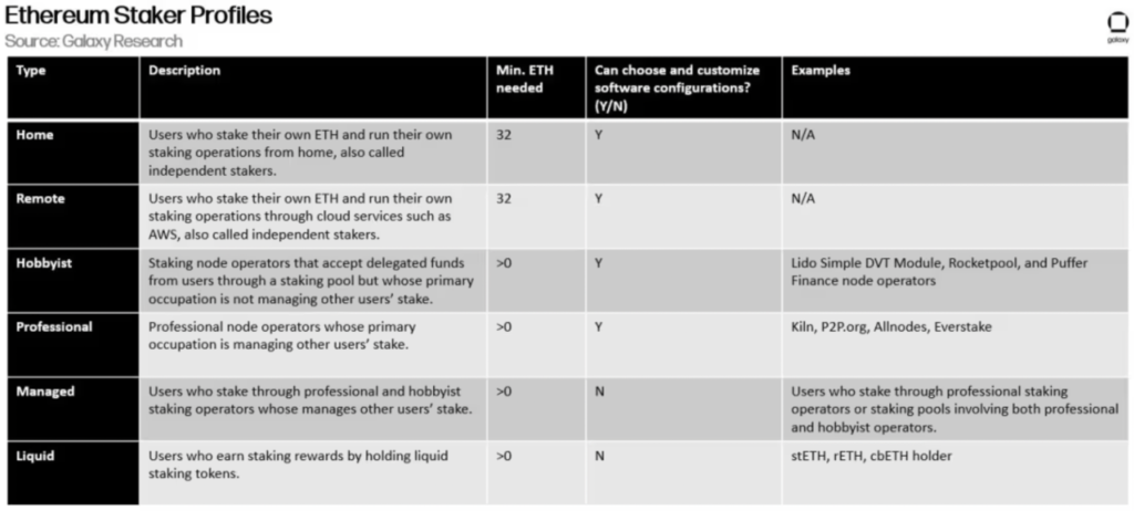 有六種主要型別的以太坊使用者可以通過質押獲得獎勵。下表詳細列出了他們各自的概況: