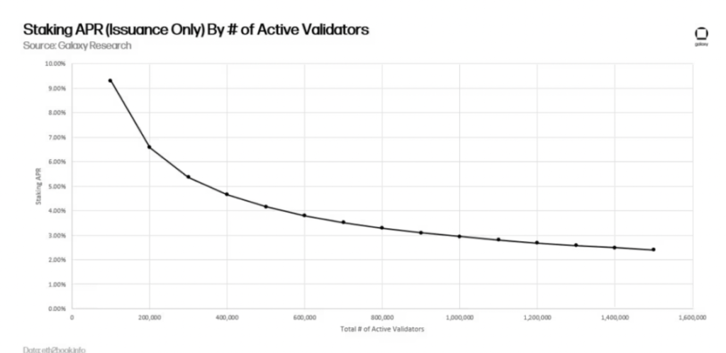 請注意,在過去 2 年中,質押者的獎勵一直在穩步下降,這主要有兩個原因。首先,質押的 ETH 總數以及驗證者的數量有所增加。當質押的價值增加時,驗證者的發行獎勵被稀釋,如下圖所示: