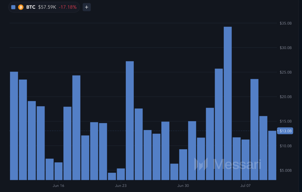 相對於整體市場,德國當局出售比特幣的直接影響似乎很小。即使在資金大量流出的日子裡,比如 6 月 8 日,比特幣流出約 7.4 億美元(約 12.36 萬枚比特幣),與整體市場流動性相比,這一數額也很小。據 Messari 資料,實際交易量通常在 100 億至 350 億美元之間。總體而言,比特幣市場的流動性很強。