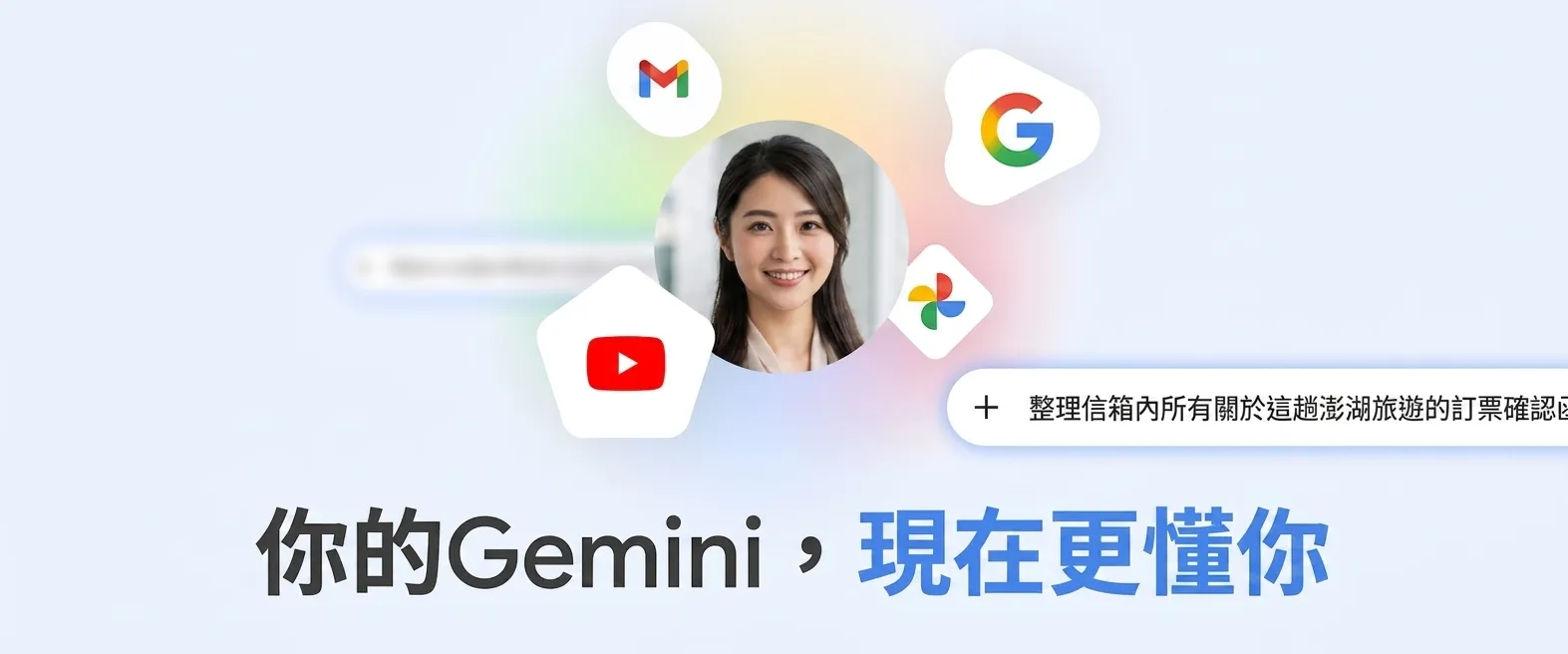 Google AI 助理 Gemini 的「個人化智慧服務」今日正式向臺灣使用者開放,透過串接 Gmail、Google 相簿、YouTube 等核心應用,讓 AI 從「懂世界」升級為「懂你」。