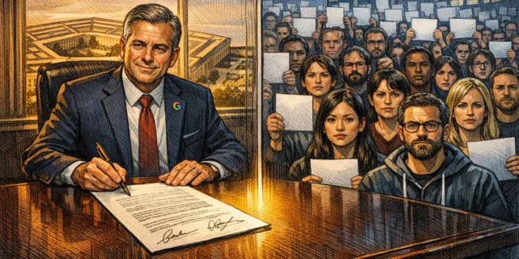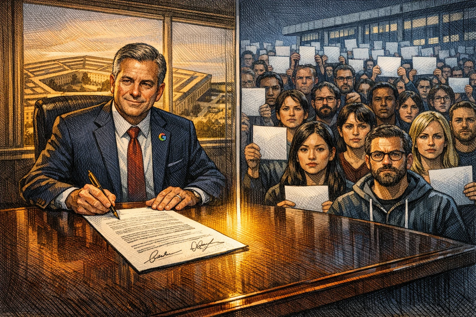 Google 已與美國國防部正式簽署約 2 億美元的 AI 軍事合約,允許五角大廈以「合法政府目的」透過 API 存取 Google 商業模型。包括 DeepMind 研究員在內的逾 600 名 Google 員工聯署公開信,要求執行長 Pichai 拒絕這筆交易,最終未能改變結果。