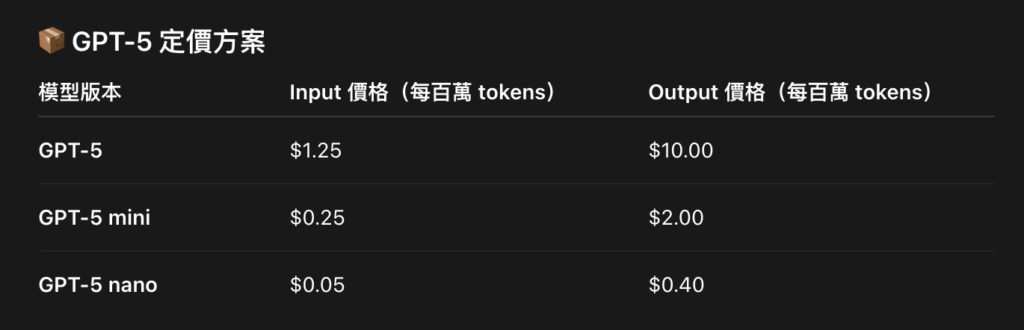 GPT-5 每百萬個輸入 tokens 收費 1.25 美元、每百萬個輸出 tokens 收費 10 美元