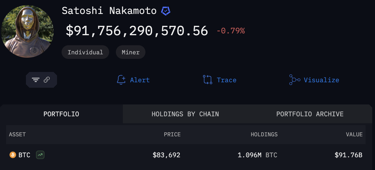 據 Arkham 數據,屬於中本聰的地址仍保有約 109.6 萬顆比特幣,現值超過 91 億美元,且自 2010 年起從未移動。即使期間多次歷經牛熊循環、價格翻漲超過 300 倍,這筆資產依然靜靜沉睡。
