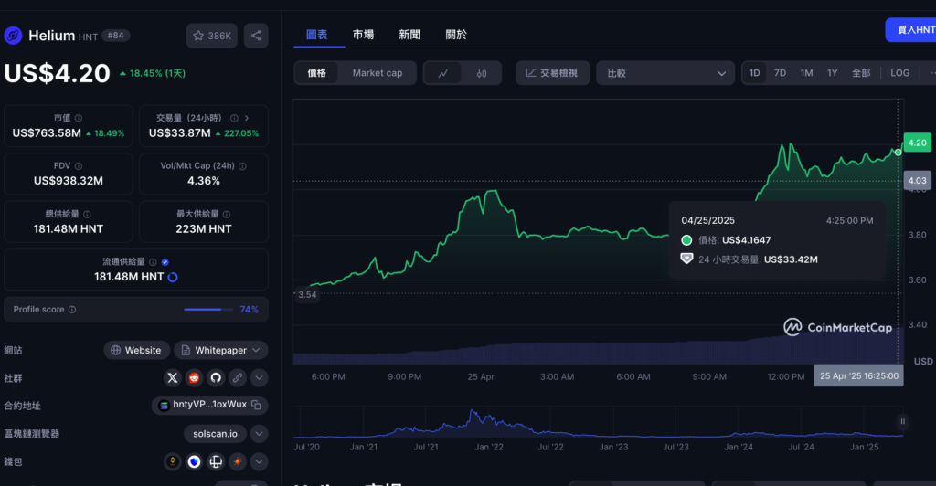 而消息一出後,也影響了Helium 代幣的價格,HNT代幣24內暴漲接近19%,來到了4.2美元左右,而類似像這樣 Depin 獲取免費的 web2 用戶的案例,可說是長期的一種利好因素,若未來 Helium 代幣與不同國家的電信業者持續完成合作,那可能會有下一波的利好。