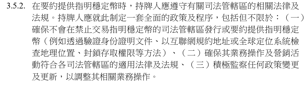 雪上加霜的是根據香港金管局《穩定幣發行人監管框架》條文,在 「要約提供指明穩定幣」 時,持牌人必須遵守相關司法管轄區的法律與規管要求。此項規定強調,不僅要確保發行合規,還需建立覆蓋跨境運營、識別禁區、主動封鎖的一整套制度性保障機制。