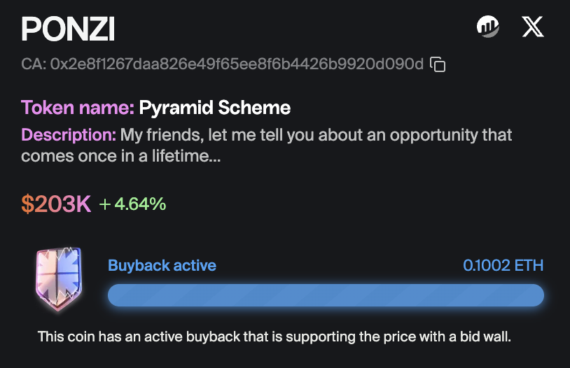 每當該迷因幣交易手續費累積至 0.1 ETH 時,就會觸發「代幣回購機制」並建立「漸進式買牆(Progressive Bid Wall,PBW)」,這取決於代幣發行者設定給社群的分紅比例,如果開發者份額為 20%,那麼 80% 將歸 PBW(社群)。