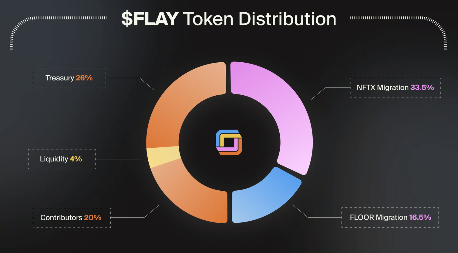 另一方面,Flaunch 治理代幣 $Flay 總供應量為 10 億枚,代幣經濟學如下: 鏈上治理(20%) 基金會儲備(6%) 代幣流動性(4%) 貢獻者(20%) NFT 遷移(50%): NFTX 佔 33.35%、FloorDAO 佔 16.65%。