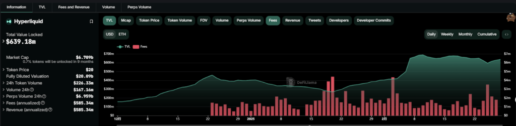 截至 2025 年 2 月 28 日,Hyperliquid(HYPE)以 24 小時協議收入 219 萬美元排名協議第七、7 天累計 1261 萬美元的表現,不僅超越 Pumpfun 等新興協議,更在去中心化永續合約賽道建立起絕對統治地位。