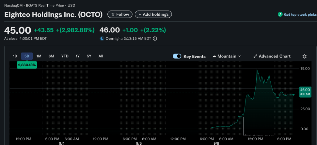 Eightco 股價(代碼 OCTO)在短短幾小時內,像脫韁的野馬般狂奔,一度暴漲近 5000%。公司的市值從無人問津的幾百萬美元,膨脹到超過 2 億美元。交易量更是達到了過去 20 天平均水平的 5.4 萬倍。市場瘋了,但這份瘋狂背後,沒有技術突破,沒有革命性產品,只有一個精心編織的故事。