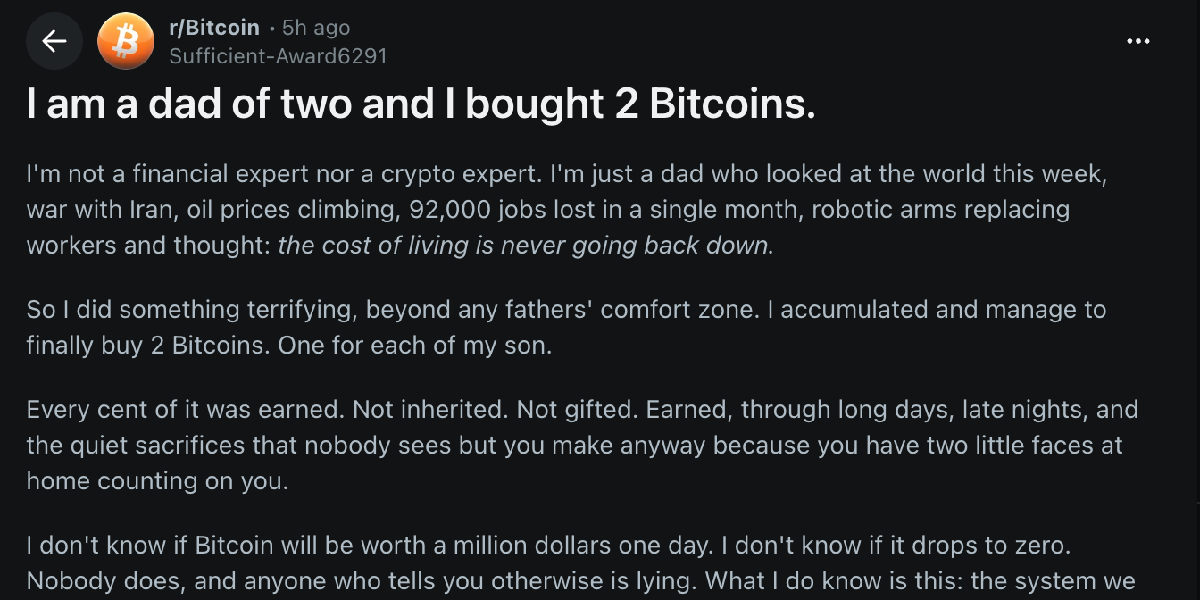 Reddit 上一位父親分享,他因擔憂戰爭、通膨與 AI 取代人工,決定為兩個兒子購入 2 枚比特幣。這並非出於貪婪,而是希望打破貧窮循環,給孩子一份無法被政府或銀行奪走的保障。