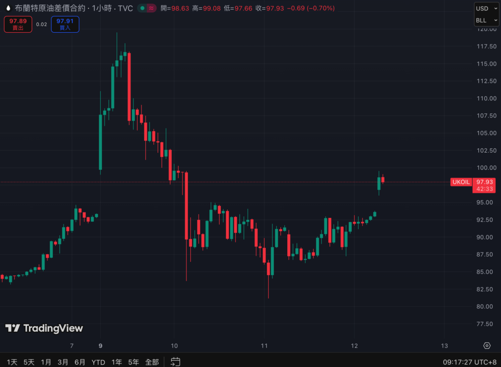 或受此影響,布蘭特原油早盤價格跳漲來到約 98 美元,距百美元大關僅一步之遙。