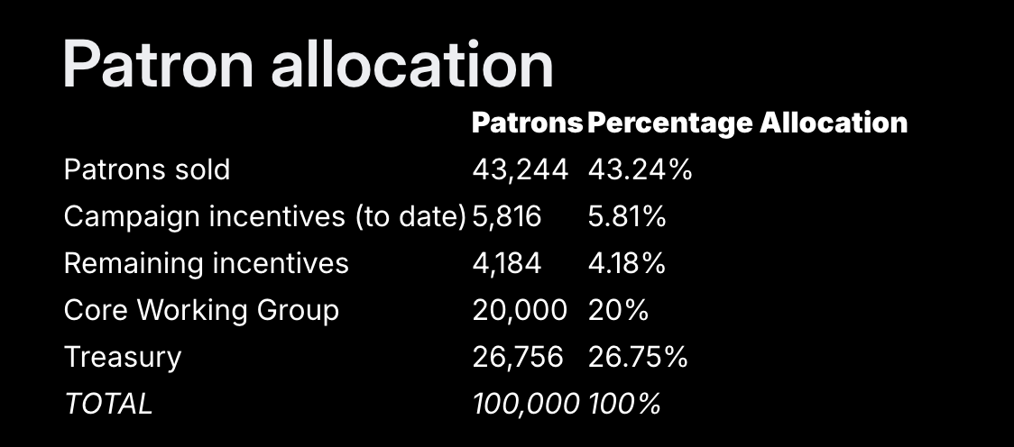 - 已售出的 Patron NFT:43244 個(43.24%);
