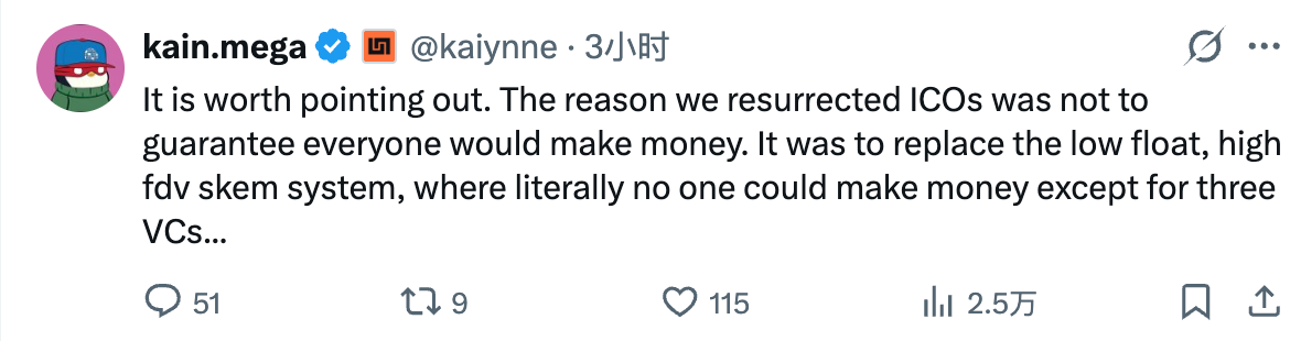 Kain Warwick 之後在個人 X 疑似對公募相關的質疑進行了回應,但內容看起來卻挺奇怪:「值得一提的是,我們復興 IC0 的目的並非為了保證人人都能賺錢,而是為了取代低流通量、高 FDV 的套利模式。在這種模式下,除了三家風險投資公司之外,幾乎沒人能從中獲利……」