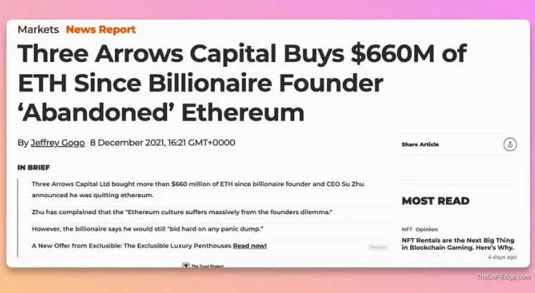 3AC 支持 Terra Luna。在上個月 Terra 崩盤之前,3AC 斥資 5.596 億美元接盤了那些被鎖倉的 Luna,現在價值約為 670 美元,有人猜測 Luna 的巨額損失,導致他們想要使用更多的槓桿來拿回利潤,這很明顯是情緒帶來的主觀的「過度交易」。