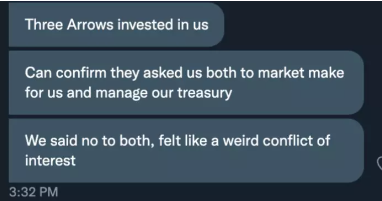 所以我們現在所面臨的情況是:項目方融資的錢和他們的國庫可能已經不見了……我也已經向另一個協議確認,3AC 提供財務管理服務。