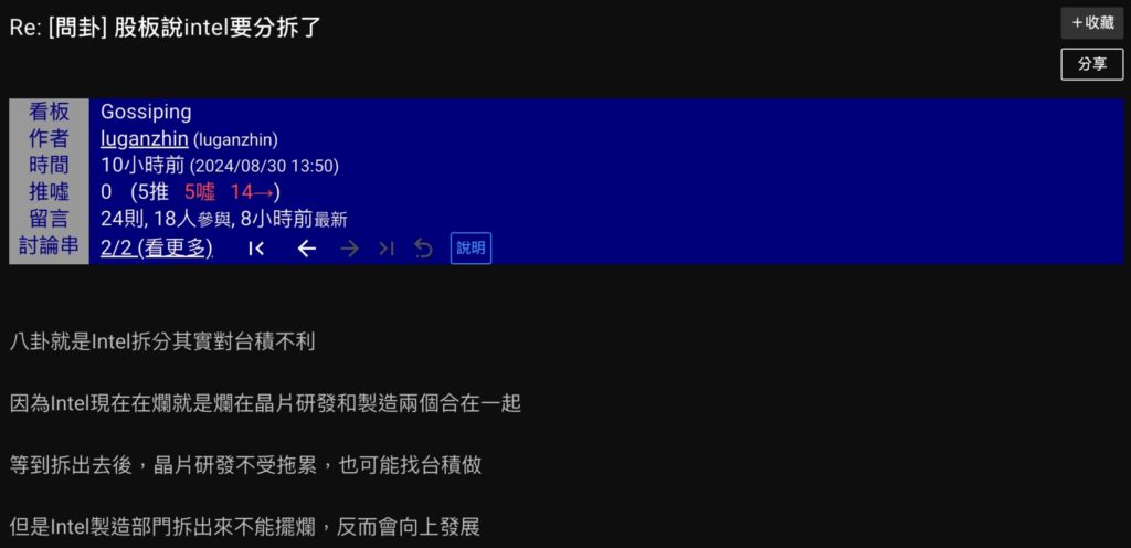 針對英特爾傳出分拆的消息,大量台灣網友在 PTT 上進行討論,有人認為美國政府不會放任台積電再度加大對晶圓代工的市占率,留言表示「分拆英特爾對台積電不是好事」、「不可能讓台積電和美國以外的公司吃下的,美國政府不會放」、「拆分出去就是搶成熟製程,退出燒錢的先進製程行列」…