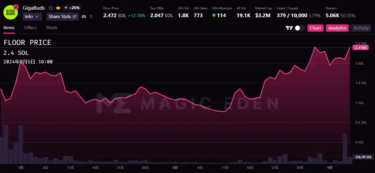 值得一提,Grass 隱形發射的 NFT 專案 GigaBuds 在代幣空投查詢訊息釋放後,並沒有下降,而是出現小幅上漲,暫報 2.472 SOL,24 小時漲幅 12.18%。
