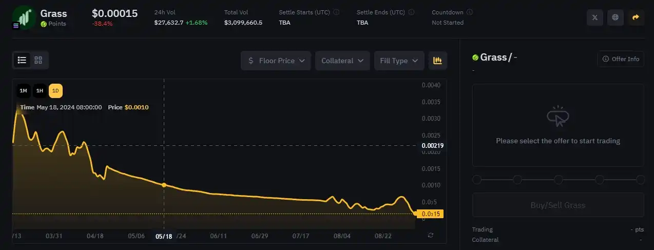 目前,Grass 代幣場外交易均沒有上線大家所熟知的場外交易平臺 AEVO 與 Whales Market,Whales Market 僅在先前上線了 Grass 積分的場外交易市場,隨著代幣空投訊息的釋放,其場外價格大幅下跌,現報每積分 0.00015 美元,24 小時跌幅近 40%。