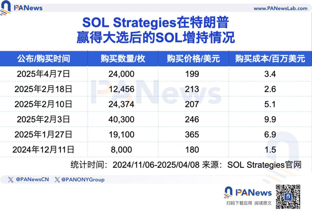 SOL Strategies 在川普當選後累計投入 2,940 萬美元,購入了超過 12.8 萬枚 SOL,佔其總持倉量(26.7 萬枚 SOL)的 47.9%。然而,其購入時機多集中在價格高位。例如,2025 年 2 月 3 日,SOL Strategies 宣佈購入 40,300 枚比特幣,成本為 246 美元;而 2025 年 1 月 27 日購入 19,100 枚比特幣,成本卻高達 365 美元。這種高位買入策略導致 SOL Strategies 的平均買入價達到約 235 美元。以當前 108 美元的市場價格計算,其帳面浮虧已超過 1628 萬美元。儘管如此,SOL Strategies 將其持有的超 26.5 萬枚 SOL 用於質押,通過質押獎勵有效緩解了部分損失。
