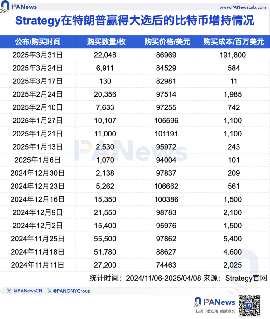 從這一段時間內 Strategy 的購買策略來看,可以明顯觀察到其從激進擴張到謹慎觀望的策略轉變。具體而言,在 2024 年 11 月,比特幣價格處於高位階段,Strategy 大舉增持了超過 13.4 萬枚比特幣,佔該期間總增持量的約 48.7%,表現出其激進的市場擴張態度,並體現出對市場長期看漲的強烈信心。進入 2025 年後,隨著比特幣價格回撥,Strategy 採取了更為謹慎的策略,大幅減少了購買量,進入了觀望期。然而,最近 Strategy 表現出重新加碼的跡象,在 3 月 31 日的最新投資中投入了近 19.2 億美元。但值得注意的是,Strategy 在上週並未進一步增持比特幣,在市場行情尚未明確的情況下,其仍保持一定的觀望態度。