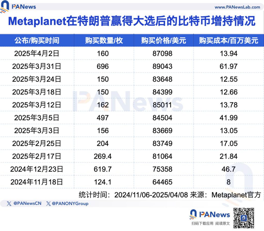 自 2024 年 11 月 6 日後,Metaplanet 通過 11 次增持行為購買了 3188 枚比特幣,平均購買價格為 82,001 美元,累計支出超過 2.6 億美元。以當前(4 月 8 日)比特幣價格 79581 美元計算,意味著 Metaplanet 在這段時間內的比特幣持倉目前浮虧約 2363 萬美元。而自 2024 年 4 月開始儲備比特幣以來,Metaplanet 累計花費超 3.6 億美元購買了 4206 枚 BTC,這表明其在川普當選之後明顯加大了比特幣的儲備力度。然而,以比特幣整體 86,500 美元的購買均價計算,Metaplanet 當前仍浮虧約為 2909 萬美元。