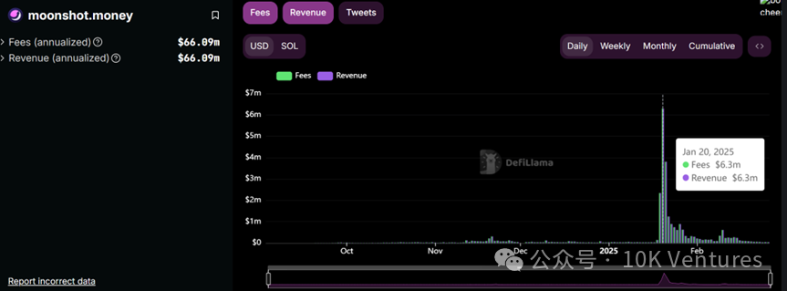 伴隨著 Trump 在 Solana 上發幣流通市值一度觸達 140 億美金,Solana/TRUMP 也開始逐漸破圈。想必在 Trump 逐漸達到 ATH 的時候,各位身邊的圈外朋友可能都在問如何購買 Trump 和 Solana。也正是在那天,Moonshot 作為非常 web2 userfriendly 的加密券商,收入達到歷史 ATH,單日收入達到 630 萬美金。