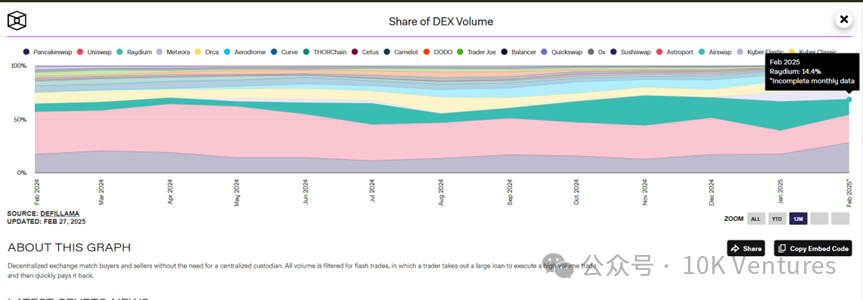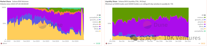 在 Pump.fun 的內盤結束後,meme 幣們會上到 Raydium 中來進行交易。25 年 1 月,dex to cex trading volume 的指數達到了近 20%,突破了過去我們所說的 15% 天花板。根據我們年報所說,Meme 幣搶奪的其實是中尾部 VC 幣的市場份額。尤其是在 Trump 夫婦在 solana 發行 meme 幣後,Solana 上的 dex 市佔率進一步提升,在 24 年 12 月,raydium (solana) vs uni (ethereum) 的市佔率對比是 19% vs 34%,但是在 1 月 20 號,Raydium 的市佔率已經和 Uni 持平,均在 25%。在最近一週的 trump trading 中,Raydium 的市佔率甚至一度超過 Uni。