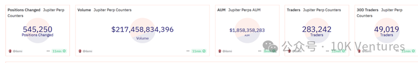 Jupiter 是 Solana 上最大的 perpdex 和 spot 聚合器。Jupiter 的核心業務主要就是:1.dex 聚合;2.perp dex;3.DCA;4. 限價單。Jupiter 不在現貨聚合交易中收取使用者任何費用,但在 Limit 和 DCA 業務中收取 0.1% 的平臺費,從下圖交易量可以看出來,Perp dex trading volume 才是主要收入貢獻點。在永續合約中,Jupiter 賺取使用者開關倉 AUM 的 0.06% 作為收入來源,其次是爆倉費用。其次,Jupiter 上線了 JLP 池,允許使用者將流動性注入池中成為 LP 和散戶進行對賭。Jupiter 的交易費用和散戶爆倉費用的一部分存入 JLP 池,因此 JLP 池的價值正在不斷上升。JUP 的 token utility 也在不斷改善,目前 JUP50% 的協議費用用來回購 JUP,給 JUP 帶來了一定的價格保障。