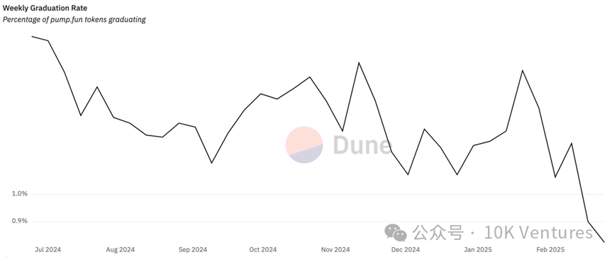 pump.fun 每日新增代幣數從 6 萬降至不足 3 萬,部分因市場對 「一鍵發幣」 模式審美疲勞,新幣成功 「畢業」(達到流動性門檻)的比例從 1.5% 降至 0.8%,反應市場對低品質專案的淘汰加速,投機資金撤離後僅少數專案能存活。