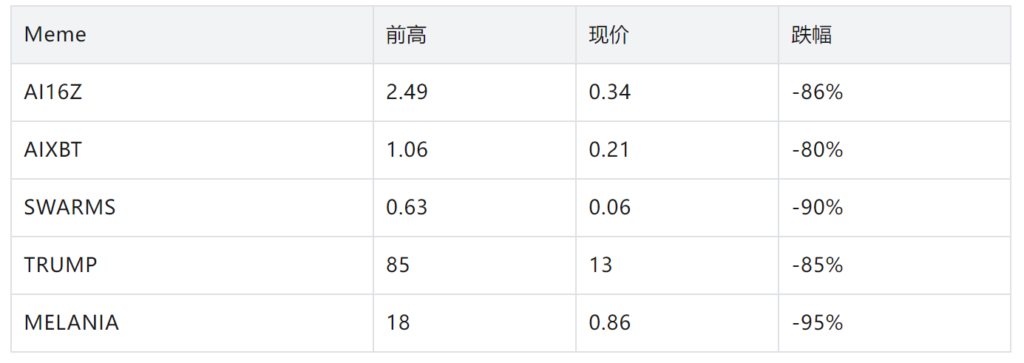 多個曾主導熱點的龍頭 Meme 代幣已從歷史高點大幅回落,普遍跌幅超 80%。