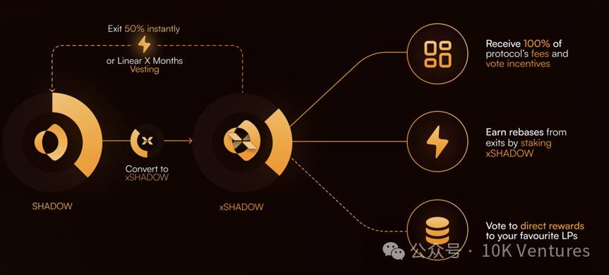 x (3,3) 在 ShadowExchange 中體現的淋漓盡致,使用者可以質押 SHADOW 從而獲得 xSHADOW。但是使用者的贖回份額會隨時間而變化,在 15 天內解鎖則需要折價兌換,並在 60 天后才可以 1:1 完全兌換,期間的折價程度線性遞減。