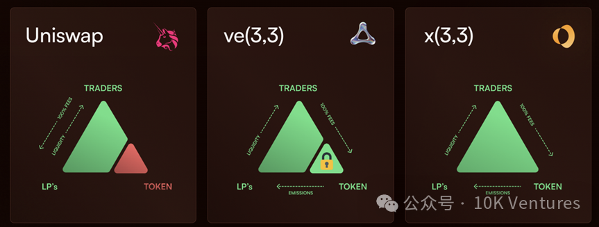 由於立刻退出需要折損 50%,而折損的部分收益由剩餘質押的人共享。這樣的一種模式使得長期質押者可以獲得:100% 的協議費用、投票獎勵和其餘退出獎勵。x (3,3) 的模式不僅吸引了長期質押者的資沉,同時也解決了 ve (3,3) 的退出問題。