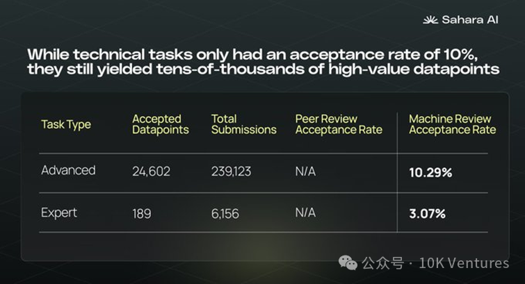近期 Sahara 在業務上有一些有趣的資料可以分享。過去我們會 charge 去中心化的資料標註產生的資料品質是否能滿足大模型的資料需求。從 Sahara Test season1 的資料我們看到雖然高階任務的接受率只有 10%,但它們仍然產生了 24000 多個對於測試 AI 模型安全性和穩健性至關重要的高價值資料點。這些任務的接受率較低表明策劃高品質、特定領域的資料集很困難。這些任務要求貢獻者生成旨在測試 LLM 邊界的邊緣對抗性輸入。總的來說 Sahara 通過自動檢查標記低品質的提交內容,去中心化的 peer review,複雜二元人物的機器審查以及最後的 Human QA review 等措施提高資料品質。後續 Sahara 將會開展 Test Season 2,繼續擴大資料標註內容。