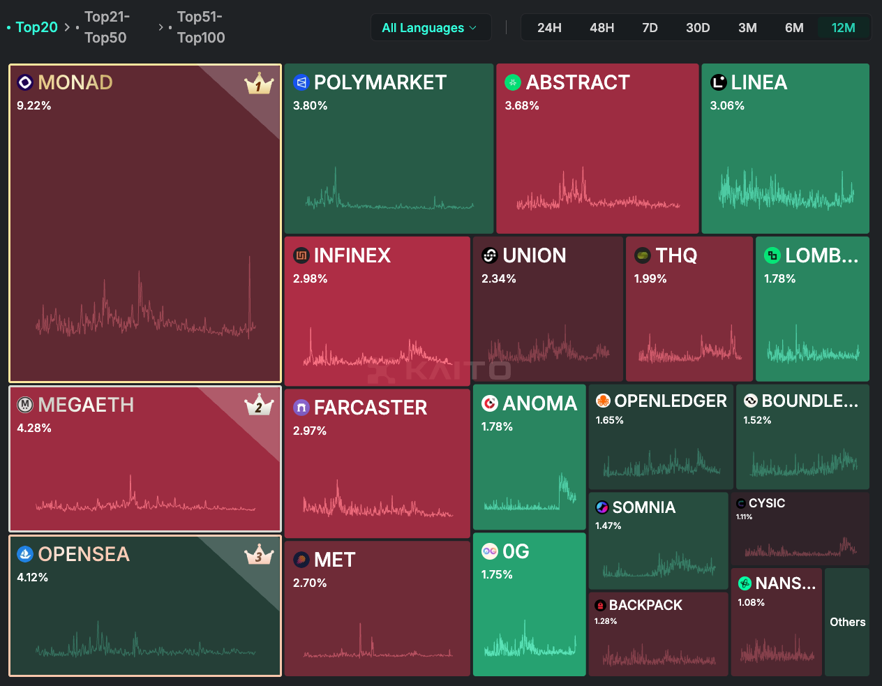 這種情況下,資金在不同的賽道之間快速切換,且持續時間很短。CT 充斥著應接不暇的資訊,各個群體大部分時間都在討論著不同的話題。這種注意力的碎片化導致資金很難像 2021 年那樣形成合力。即便某個賽道出現了不錯的行情,也很難擴散到其他領域,更不用說帶動整體的普漲。