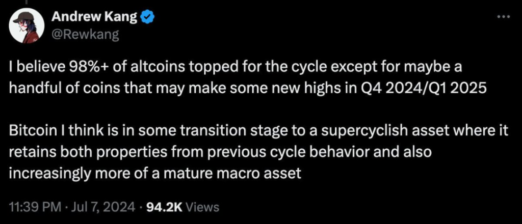 許多山寨幣可能已經見頂,但比特幣 ($BTC) 可能會進入超級週期。儘管全球流動性可能激增,但這挑戰了山寨幣是最快馬匹的假設。