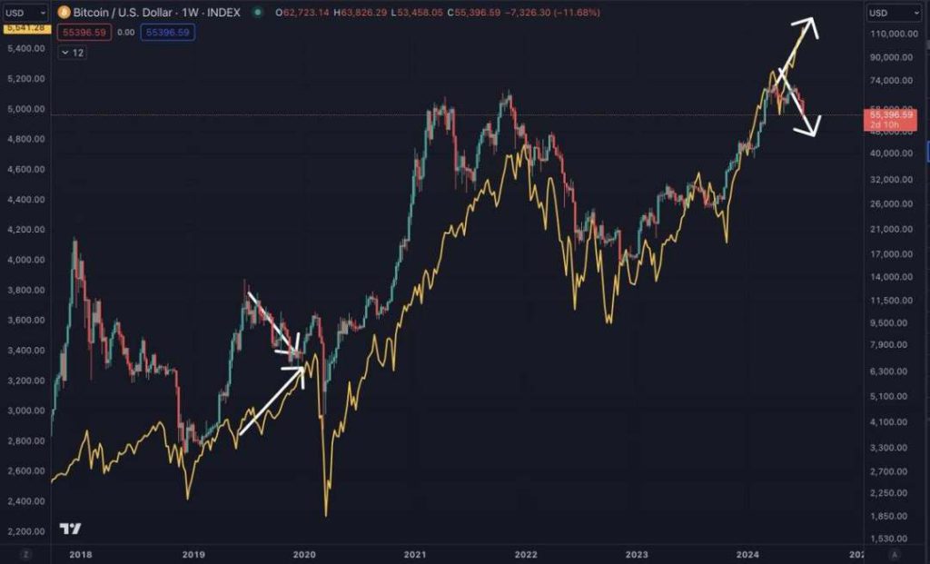比特幣 ($BTC) 與標普 500 ($SPX) 的分歧類似於 2019 年,當時比特幣在 6 月達到頂峰。花了 12 個月以上才創下新高。