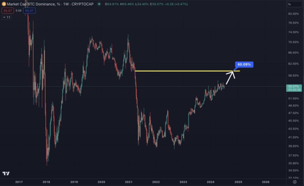 @intocryptoverse 認為比特幣主導地位 ($BTC.D) 到 2024 年第四季度可能達到 60%。
